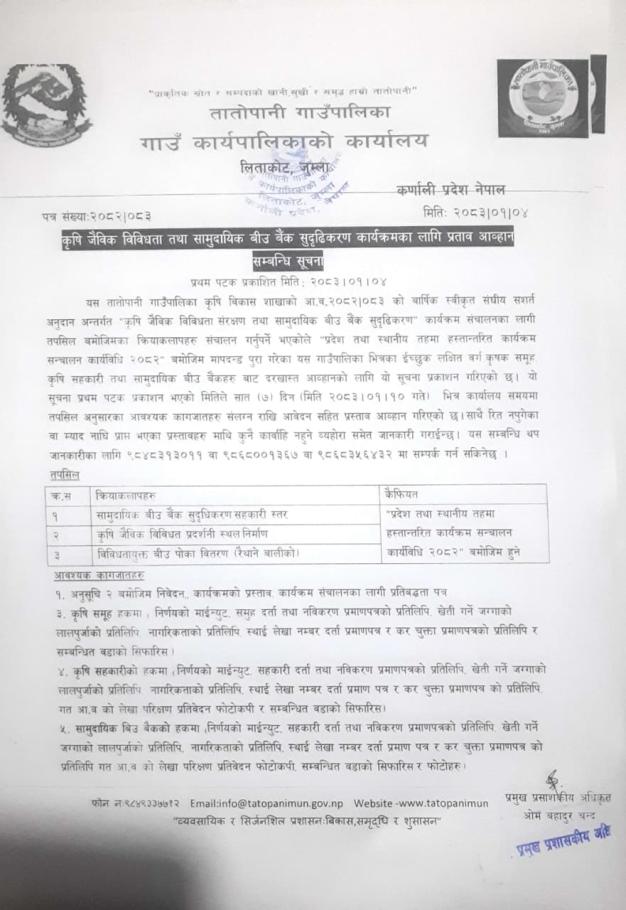 कृषि सम्बन्धि प्रस्ताव आह्वान सम्बन्धी सूचना ।